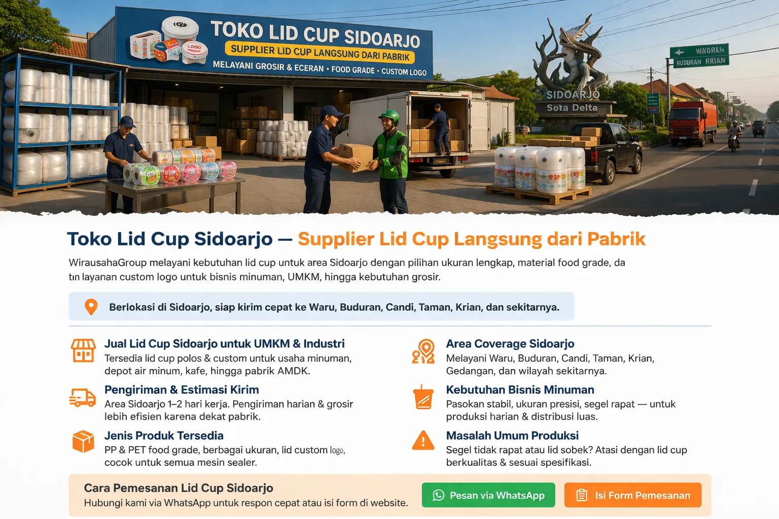 Kami melayani pengiriman ke berbagai wilayah Sidoarjo seperti Waru, Buduran, Candi, Taman, Krian, Gedangan, Porong, dan area sekitarnya sesuai kebutuhan bisnis.